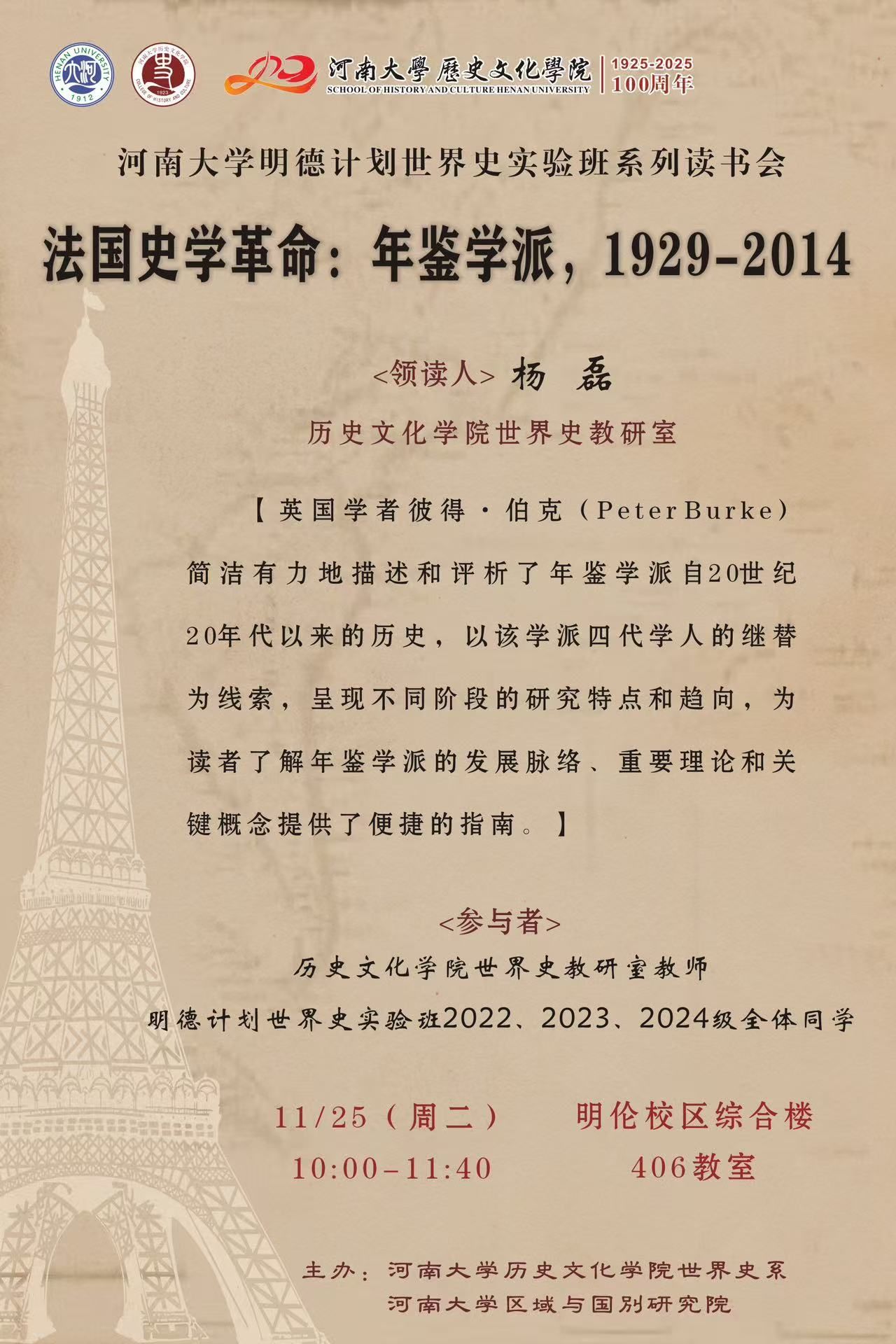 河南大学明德计划世界史实验班系列读书会:法国史学革命:年鉴学派,1929-2014