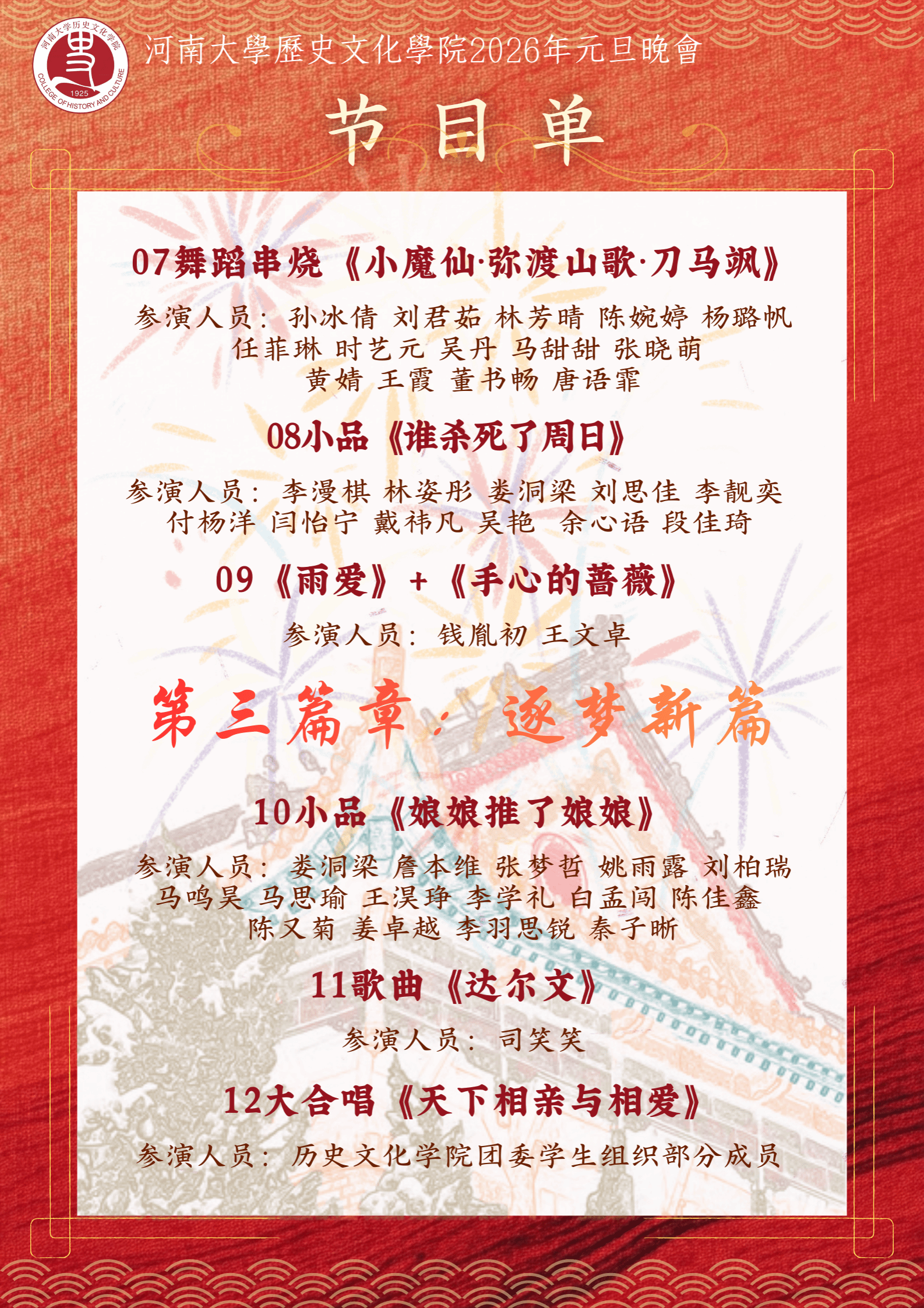 在我们身边,有这样一群小伙伴,他们以反复彩排为笔,以精雕细节为墨,只为在元旦晚会的舞台上,为大家勾勒出一场无与伦比的演出盛宴。燃动全场的舞蹈、直抵心底的歌声、演技精湛的话剧、以及笑点满满的小品等各类节目相继登场,高潮不断,令人大饱眼福。