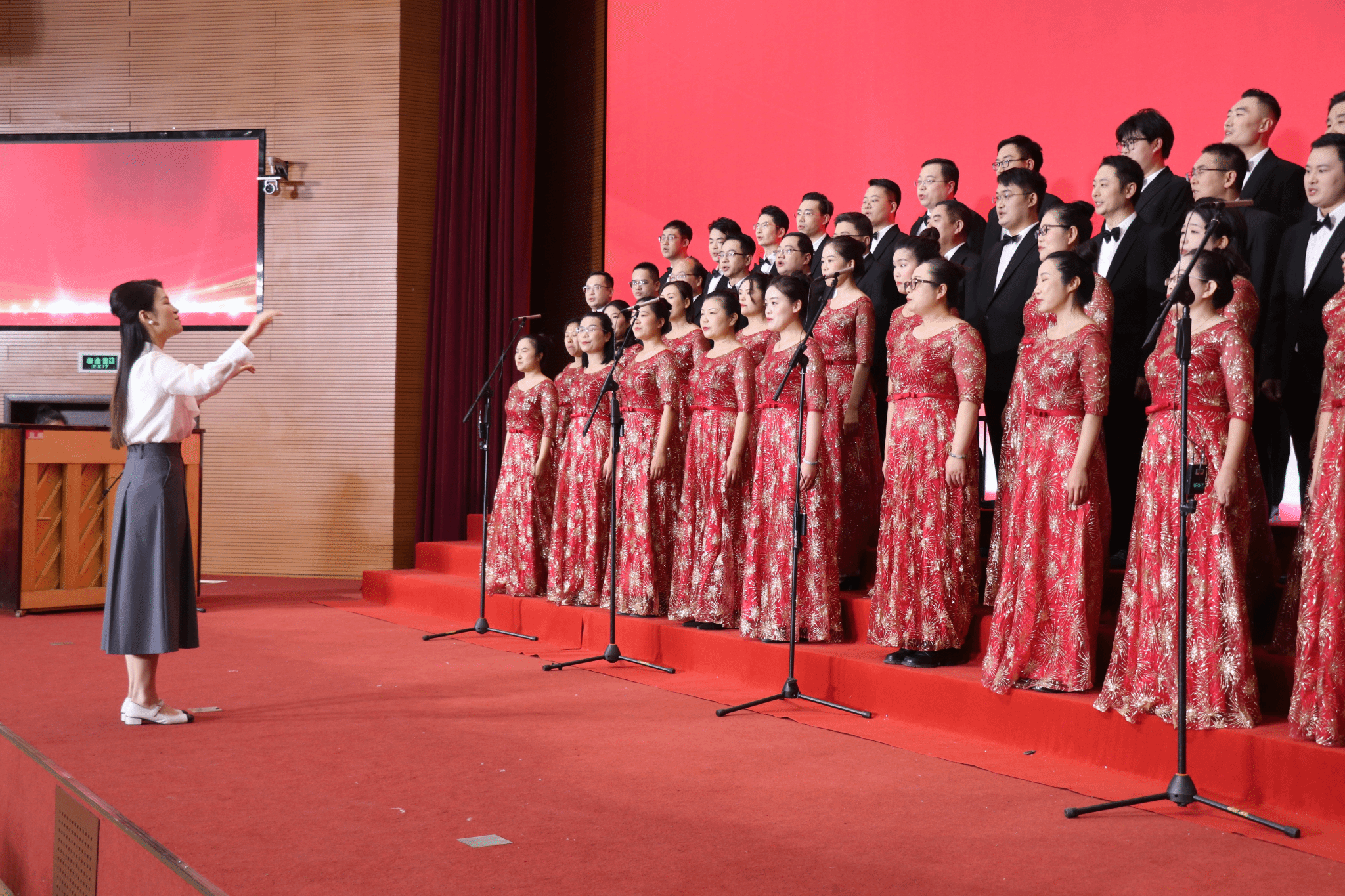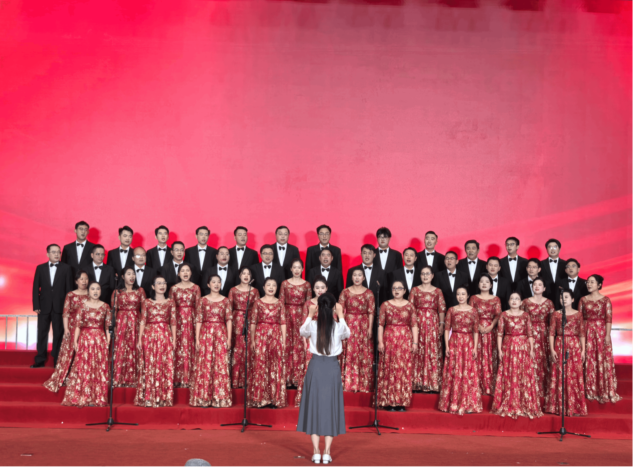 教职工着装整齐,精神矍铄:男教职工身着笔挺的黑色西装,搭配洁白衬衫与领结,尽显沉稳庄重;女教职工则身着红色金纹长裙,裙摆间的精致纹样似暗合革命岁月的热烈底色,与舞台背景的鲜红幕布相映成趣。