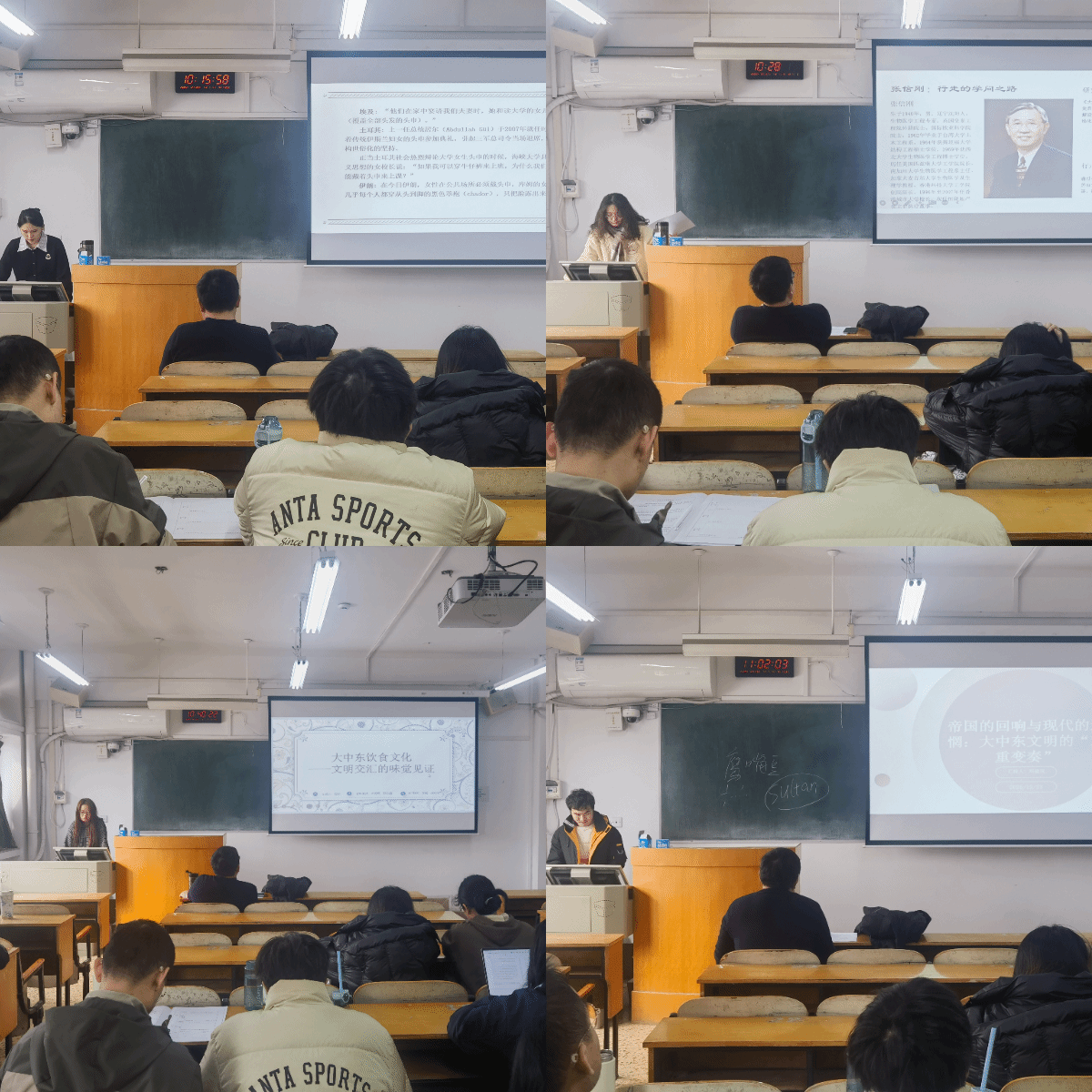 第四组由郑储双同学发言,以“大中东文明的双重变奏”为主题,尝试打破外界对中东的刻板印象,分别从伊朗的波斯文明记忆与现代化撕裂、土耳其凯末尔革命后的国家认同困境,以及阿拉伯世界破碎的统一理想等方面,分析中东各国在现代化进程中面临的困境。刘洪洁在总结中点出,应关注世俗化过程中的异化问题,并以“石油假象”为例提醒同学们:资源与财富并不必然等同于发展,研究中更应倾听现实,而非急于价值判断。