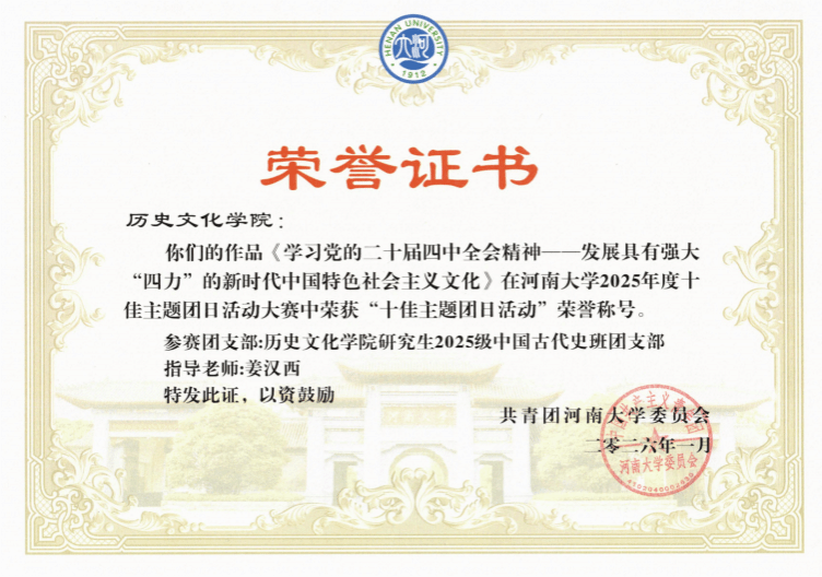 研究生2025级中国古代史班团支部以“学习党的二十届四中全会精神——发展具有强大‘四力’的新时代中国特色社会主义文化”为主题的团日活动,理念先进,形式新颖,主题鲜明,成功入选河南大学“十佳主题团日活动”。