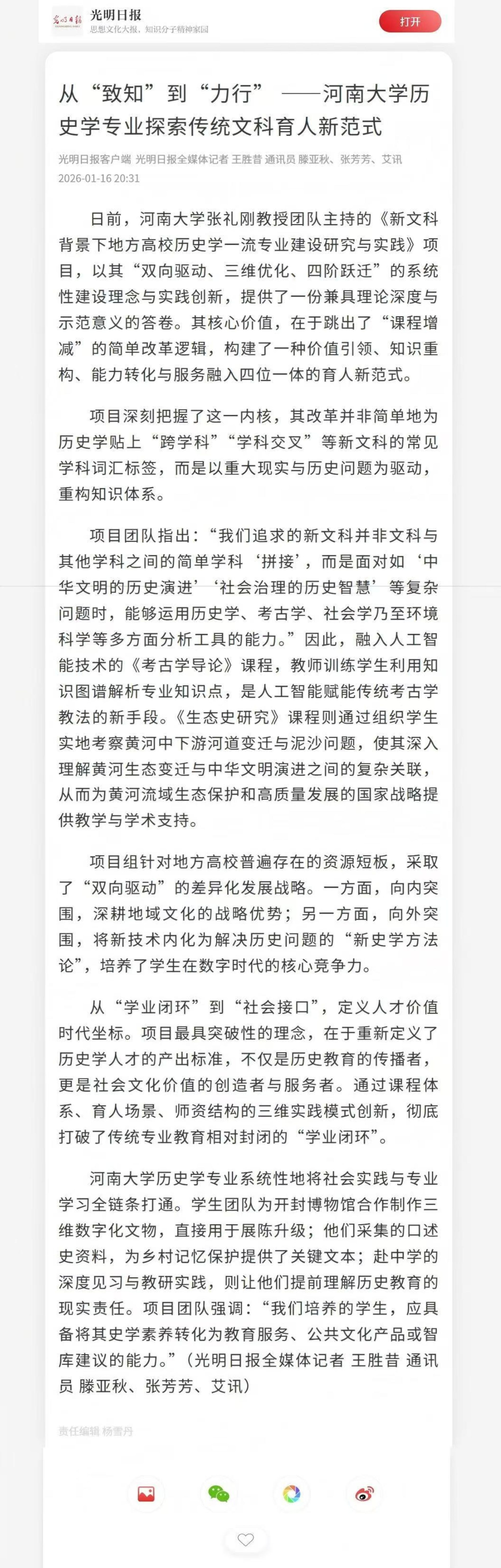 深耕学理以承古今,对接时代而育英才。《光明日报》于2026年1月16日发表以《从“致知”到“力行” ——河南大学历史学专业探索传统文科育人新范式》为题的文章,报道鱼虾蟹骰宝