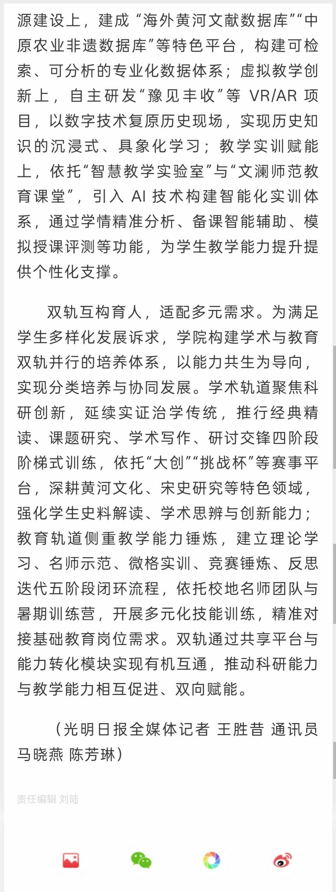 数字人文赋能,重构育人场景。学院深耕“数字人文 + 历史学”跨学科融合实践,以数字化手段革新传统史学教育生态。数字资源建设上,建成“海外黄河文献数据库”“中原农业非遗数据库”等特色平台,构建可检索、可分析的专业化数据体系;虚拟教学创新上,自主研发“豫见丰收”等VR/AR项目,以数字技术复原历史现场,实现历史知识的沉浸式、具象化学习;教学实训赋能上,依托“智慧教学实验室”与“文澜师范教育课堂”,引入AI技术构建智能化实训体系,通过学情精准分析、备课智能辅助、模拟授课评测等功能,为学生教学能力提升提供个性化支撑。