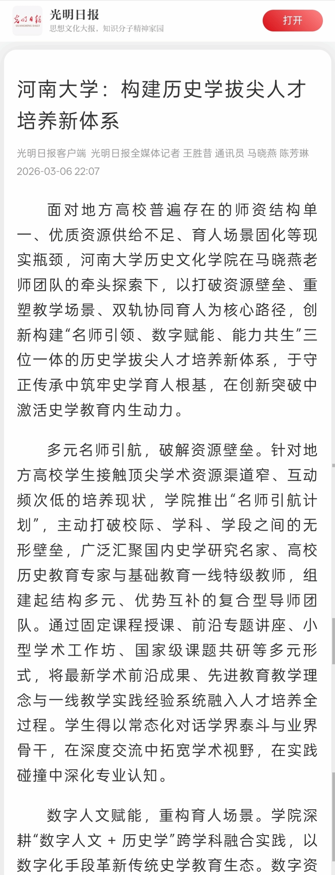 守正传承铸根基,创新育人启新篇。《光明日报》于2026年3月6日发表以《河南大学:构建历史学拔尖人才培养新体系》为题的文章,报道鱼虾蟹骰宝